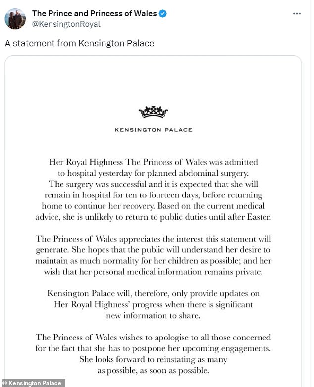 The Princess of Wales will be spending close to two weeks at the hospital after having a successful abdominal surgery, the royal aides mentioned today. Meanwhile, others spoke about how the King is also set to undergo surgery by next week for his enlarged prostate gland.
