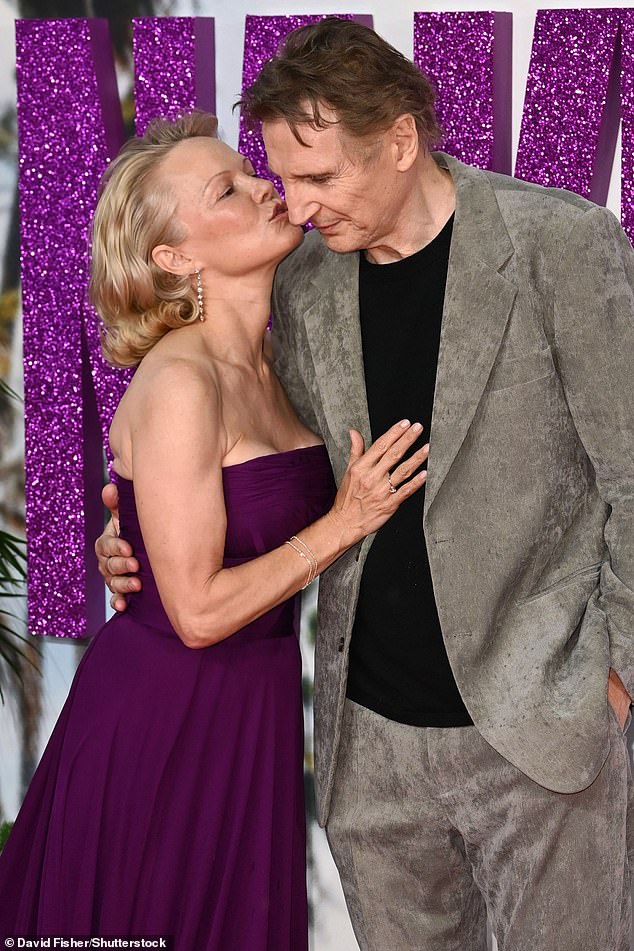 Pamela Anderson and Liam Neeson were seen getting romantic at the red carpet premiere of their latest film, which is dubbed’ The Naked Gun’ in London.