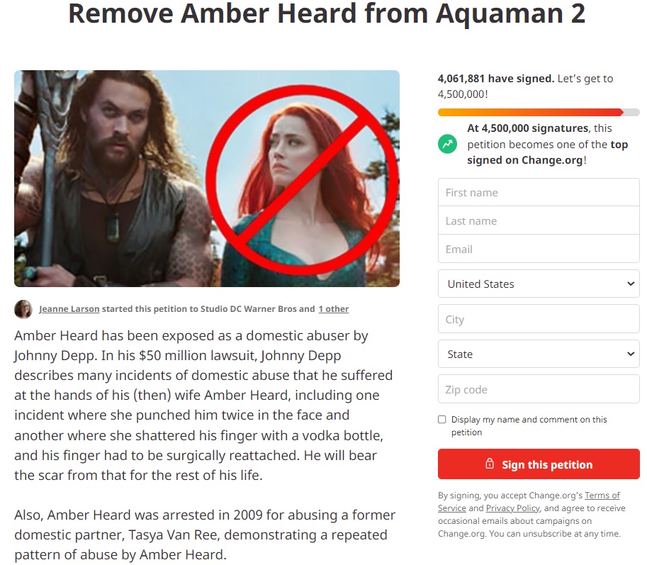 The petition to remove Amber Heard from the Aquaman sequel has reached a new high and became one of the most signed petitions ever.