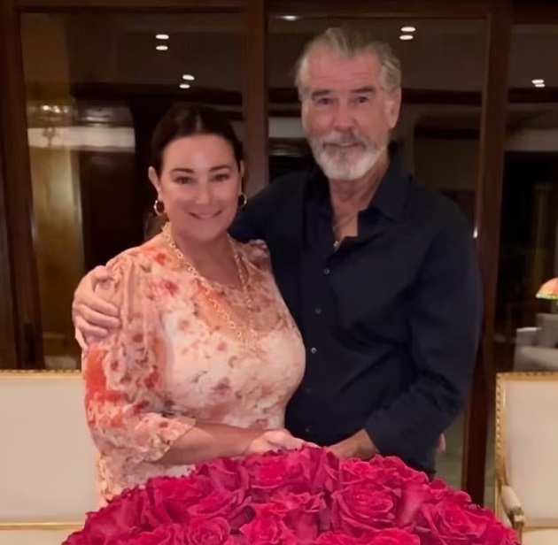 Brosnan also posted a touching message along with a snap showing the couple posing in a warm embrace behind the large bouquet.