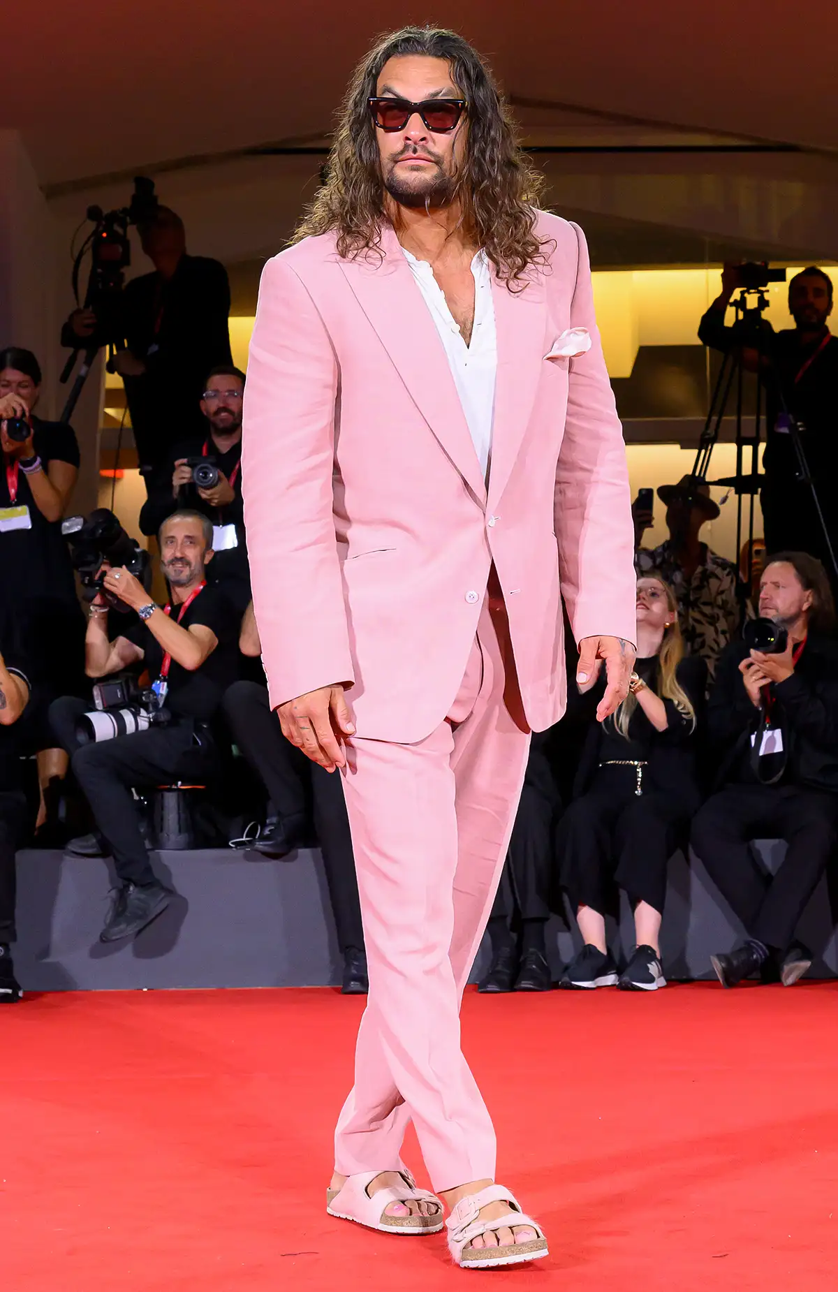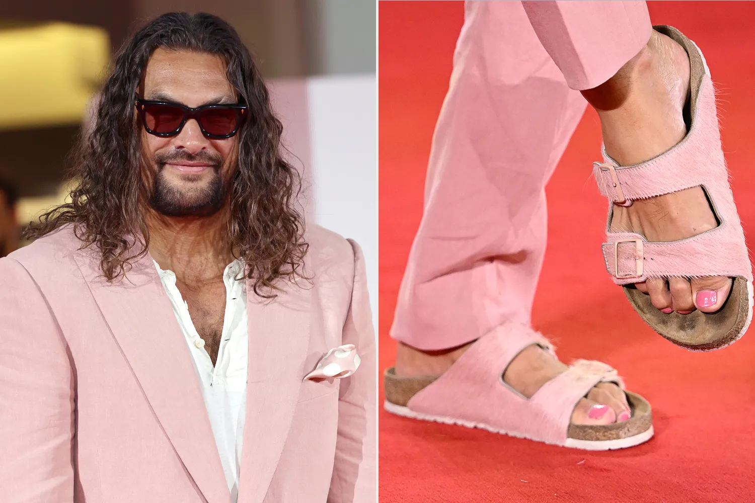 For the photo op, the actor wore pink from head to toe, literally. Momoa modeled a tailored pink jacket and pants set paired with pink Birkenstocks of the same color. But his love for pink did not end there.