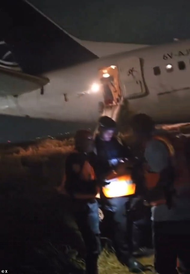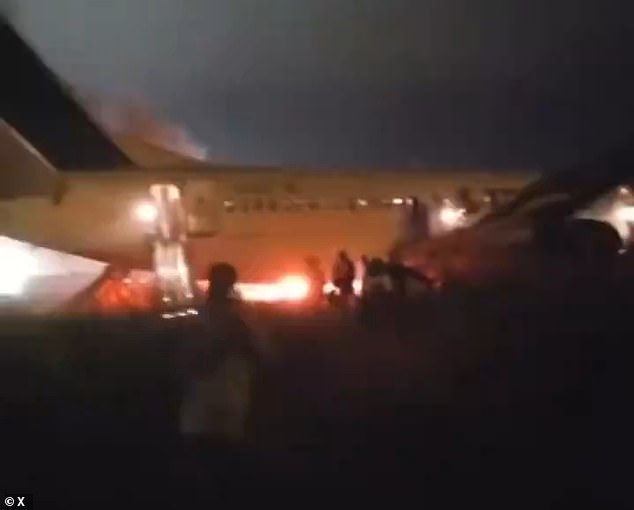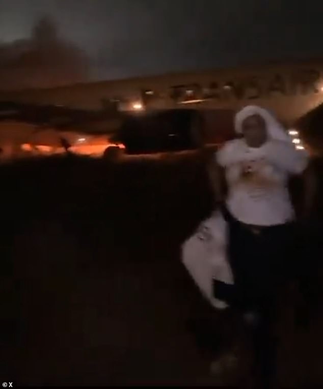 Shocking footage showed the exact moment when terrified passengers fled the burning jet as it skidded off the runway and caught fire in Senegal during the early hours of the morning.