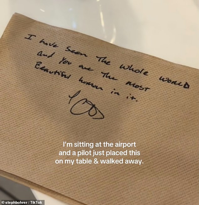 Well, the pilot just wanted to let her know that he’s traveled the world but never come across someone as beautiful as her! Yes, he put the napkin on her table and walked away.