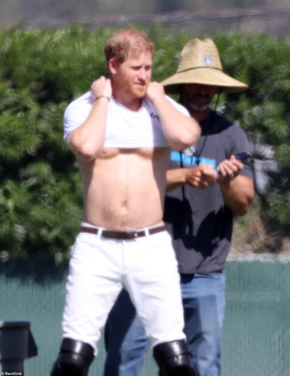 The Duke of Sussex appeared as if the heat was bothering him and therefore to help cool things down, he chose to bear half of his body which the cameras couldn’t help but capture.
