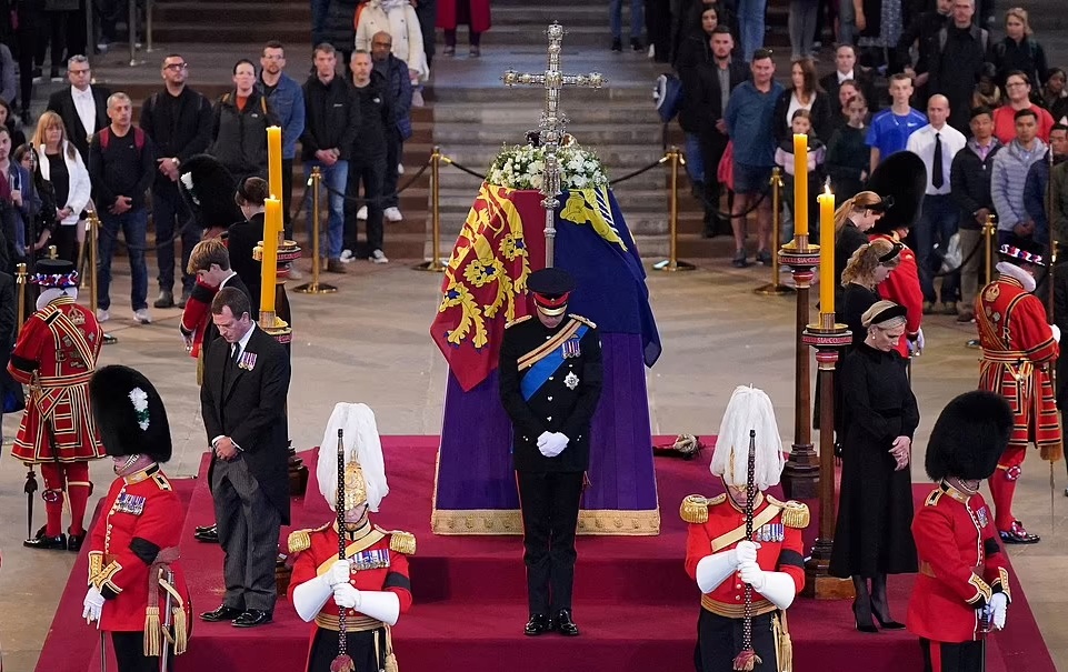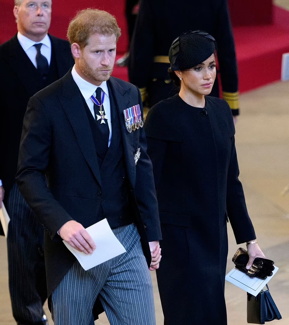 The couple’s exclusion from the reception comes shortly after Prince Harry’s uniform was stripped of the late Queen’s ‘ER’ initials for a vigil at the Her Majesty’s coffin.
