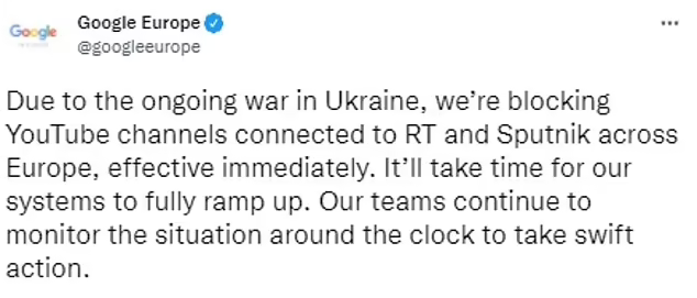 Earlier on Friday, Meta – the parent company of Facebook – announced that Sputnik and RT would be banned from Instagram and Facebook in the UK, three days after the sites were barred across Europe.