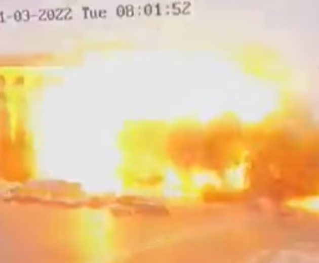 According to reports, a rocket landed in front of the civilian public administration building in Kharkiv, destroying the building’s window and the road outside.