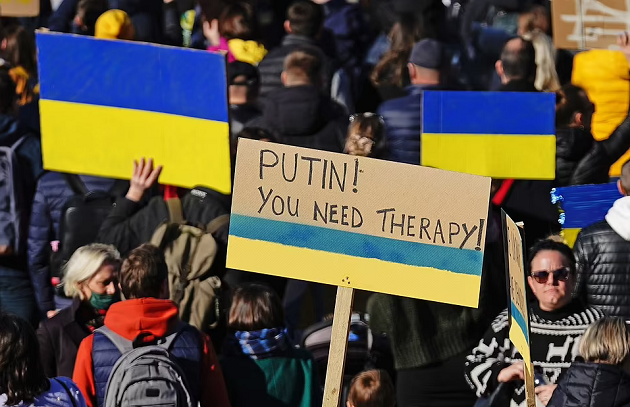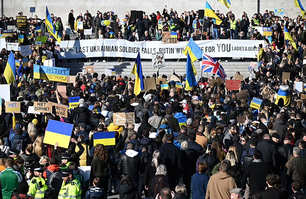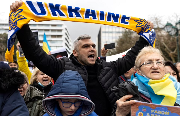 Protesters waved Ukrainian flags to show their support while others brought placards with slogans such as ‘Putin, go to therapy and leave Ukraine and the world in peace,’ and ‘Hands off Ukraine.’