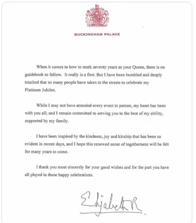 Her Majesty said in her message: “When it comes to how to mark seventy years as your Queen, there is no guidebook to follow. It really is a first. But I have been humbled and deeply touched that so many people have taken to the streets to celebrate my Platinum Jubilee.”