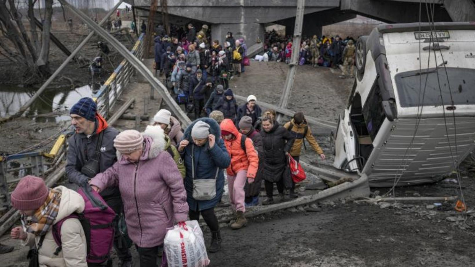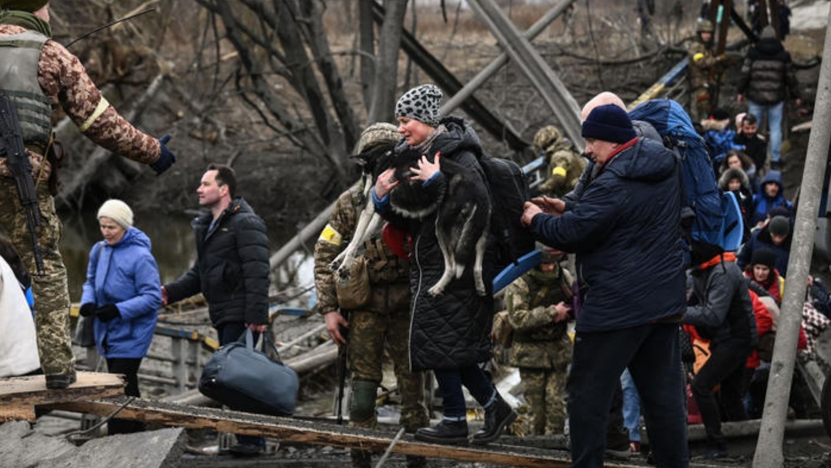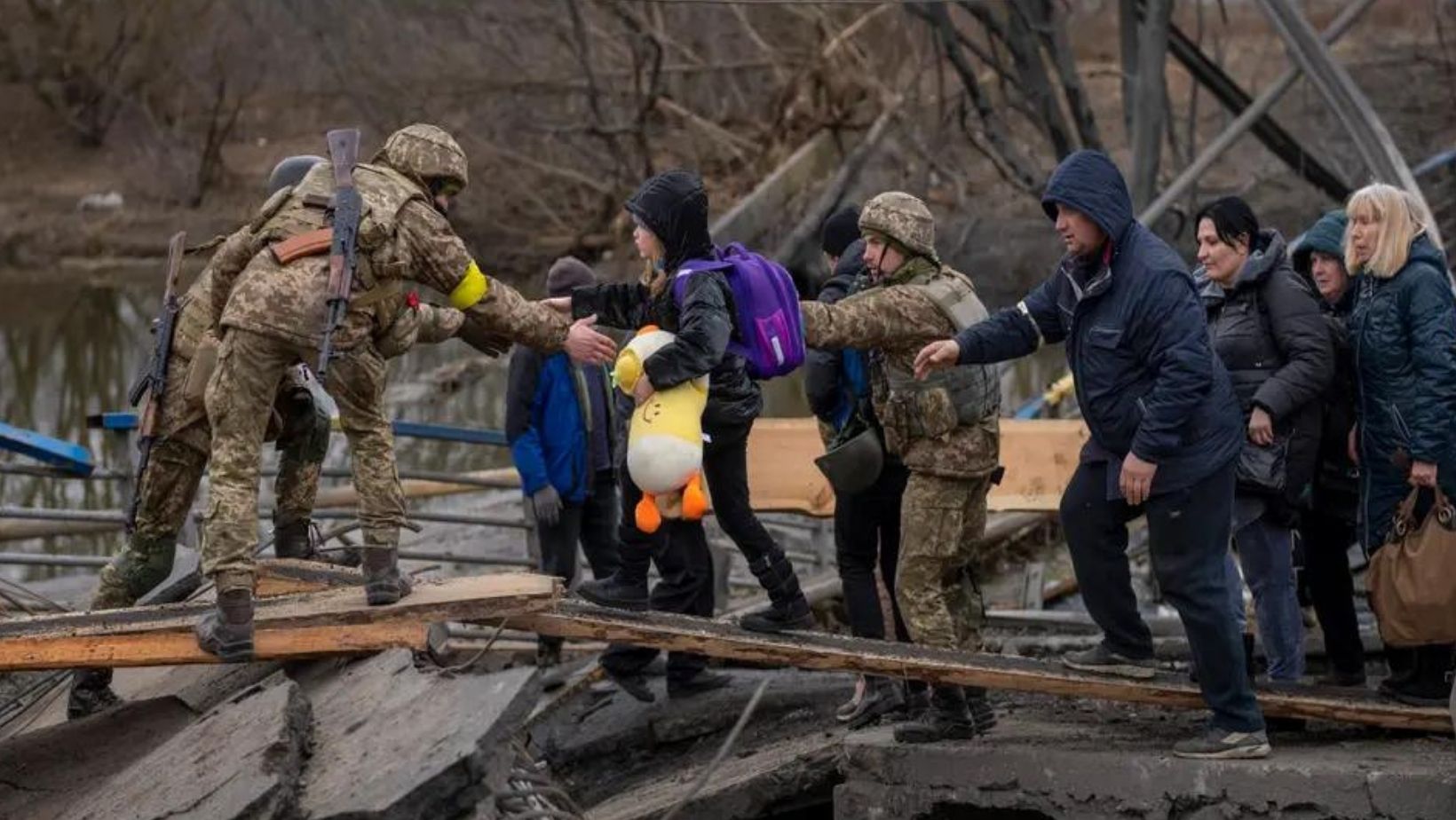 Residents were helped across a partially-destroyed bridge by members of the Ukrainian military who had blown it up days earlier to slow the Russian advance.
