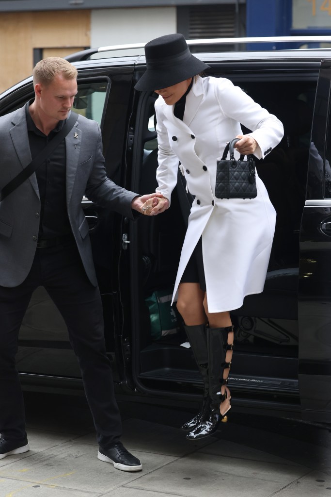 The celeb was seen wearing a stylist outfit and needed a little help from her security team while getting out of the vehicle.