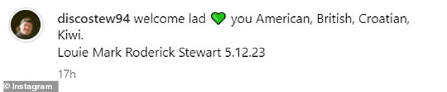 He mentioned, ‘Welcome Lad, I love you!’- and it featured the little beautiful baby boy who was adorable. He was referred to as an American, British, Croatian, and Kiwi. Louie Mark Roderick Stewart was his name as confirmed by the proud parents.