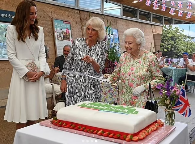 A third image, taken at the G7 Summit in 2020, shows Kate, the Queen, and Camilla smiling as they look over a replica of a model city.