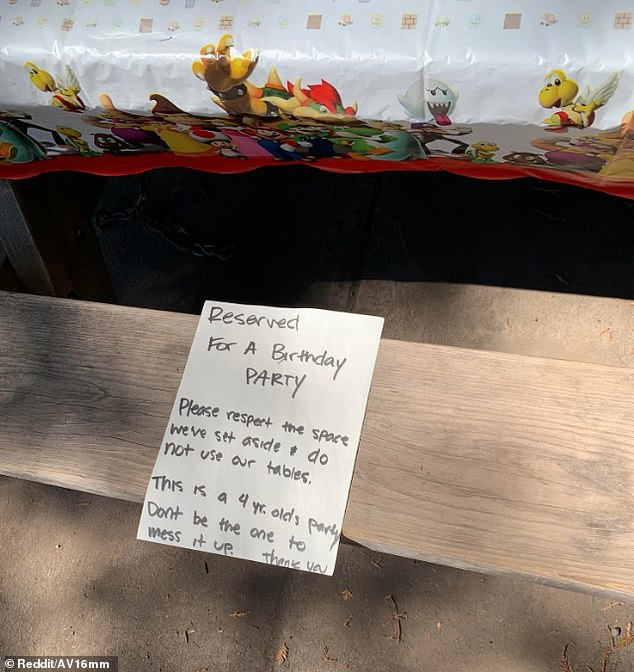 The party planners put tablecloths on three tables alongside a very rude note and it really made so many people upset. The note in question called for the park users not to ‘ruin’ their child’s party by using these tables.
