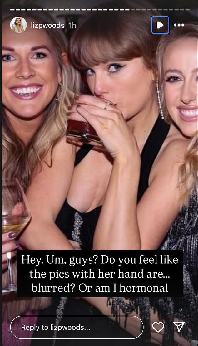 It appeared as if Swift’s hands in the group photos were blurred and that might be related to the fact that she was engaged to Kelce and therefore didn’t want to showcase her giant ring.
