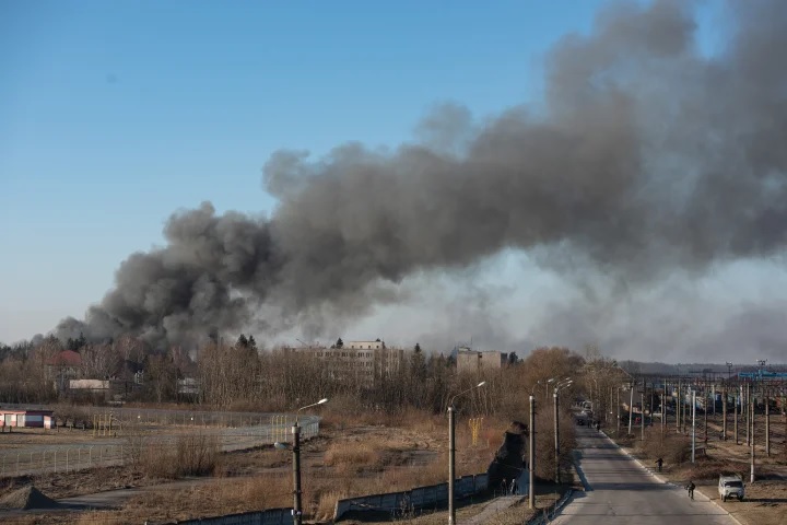 The airport, which lies just 43 miles from the border between Poland and Ukraine, was struck by an undisclosed number of non-nuclear missiles, causing massive clouds of black smoke to take over the sky in Lviv which lies on the west of the country.