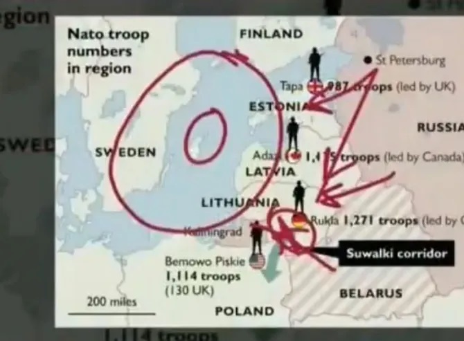 Pointing at the sickening war map, Korotchenko focused on the Suwalki gap, which lies between Belarus and Russia’s Kaliningrad, and said Russia could block the entire region to prevent NATO countries from aiding Lithuania, Latvia, and Estonia before occupying the three NATO countries and forcing them to pledge allegiance to Russia.