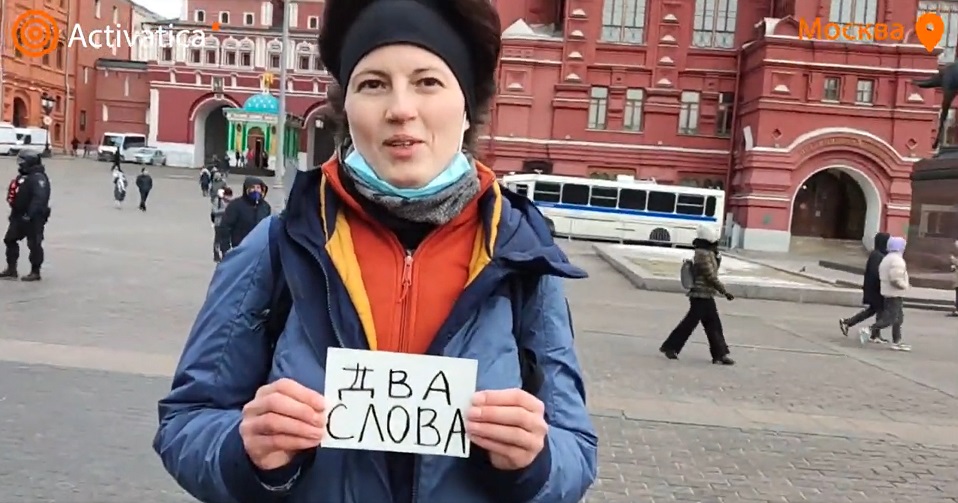 A Russian woman was viciously arrested by several armed police officers after holding up an innocent sign that read ‘two words’.