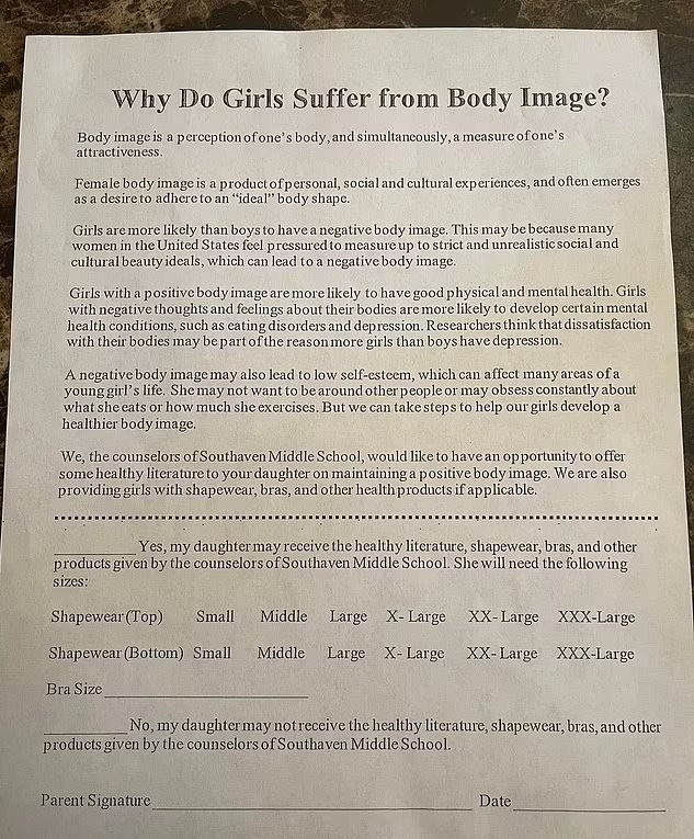 “We, the counselors of Southaven Middle School, would like to have an opportunity to offer some healthy literature to your daughter on maintaining a positive body image. We are also providing girls with shapewear, bras, and other health products if applicable,” the paradoxical letter concluded.