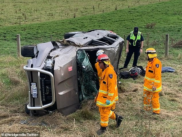 The flipped vehicle lay on its side in a giant field near Elizabeth Town, just a little distance off the Bass Highway.