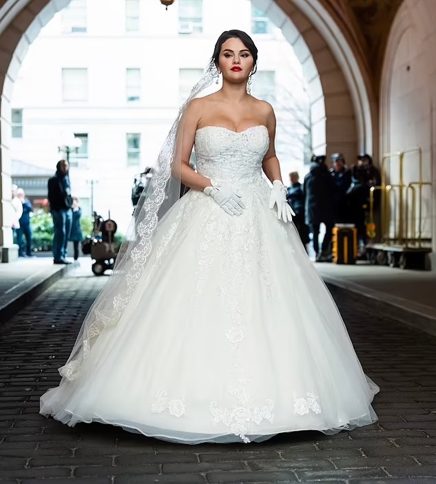 While the 30-year-old actress is yet to find a groom in real life, she wore a princess-style wedding gown while filming the third season of Only Murders in the Building in New York City.