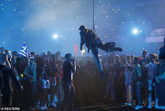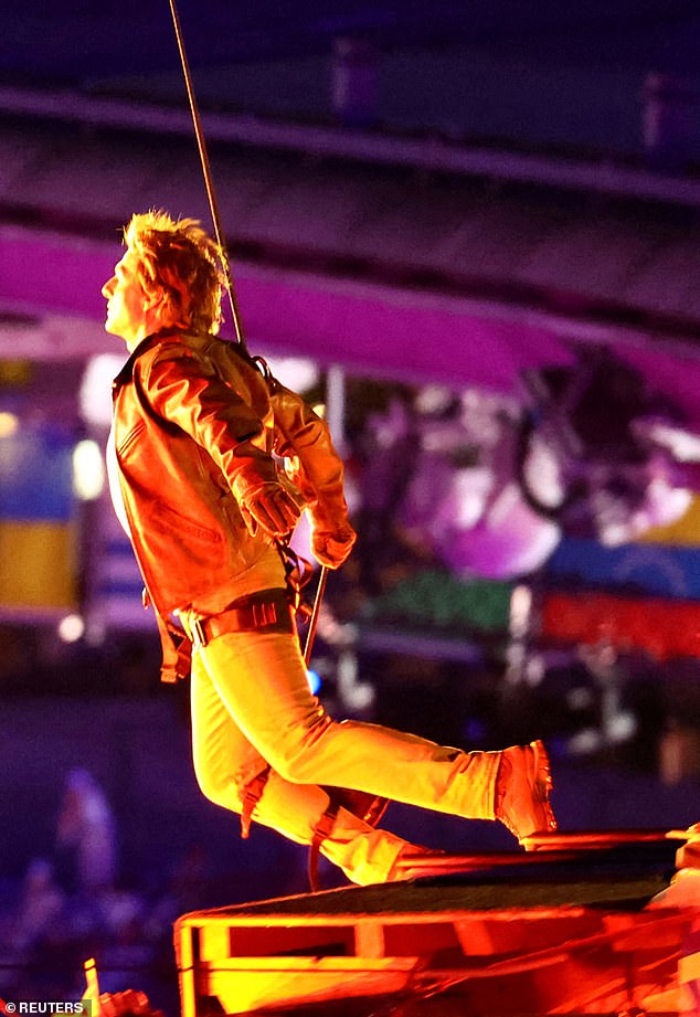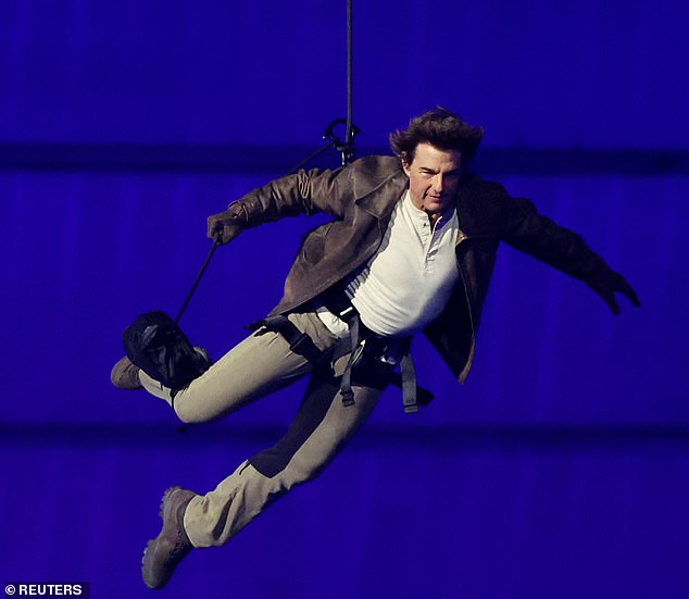 Tom was seen stepping into a harness as he flung himself off the ledge in front of thousands of fans and athletes in the audience.