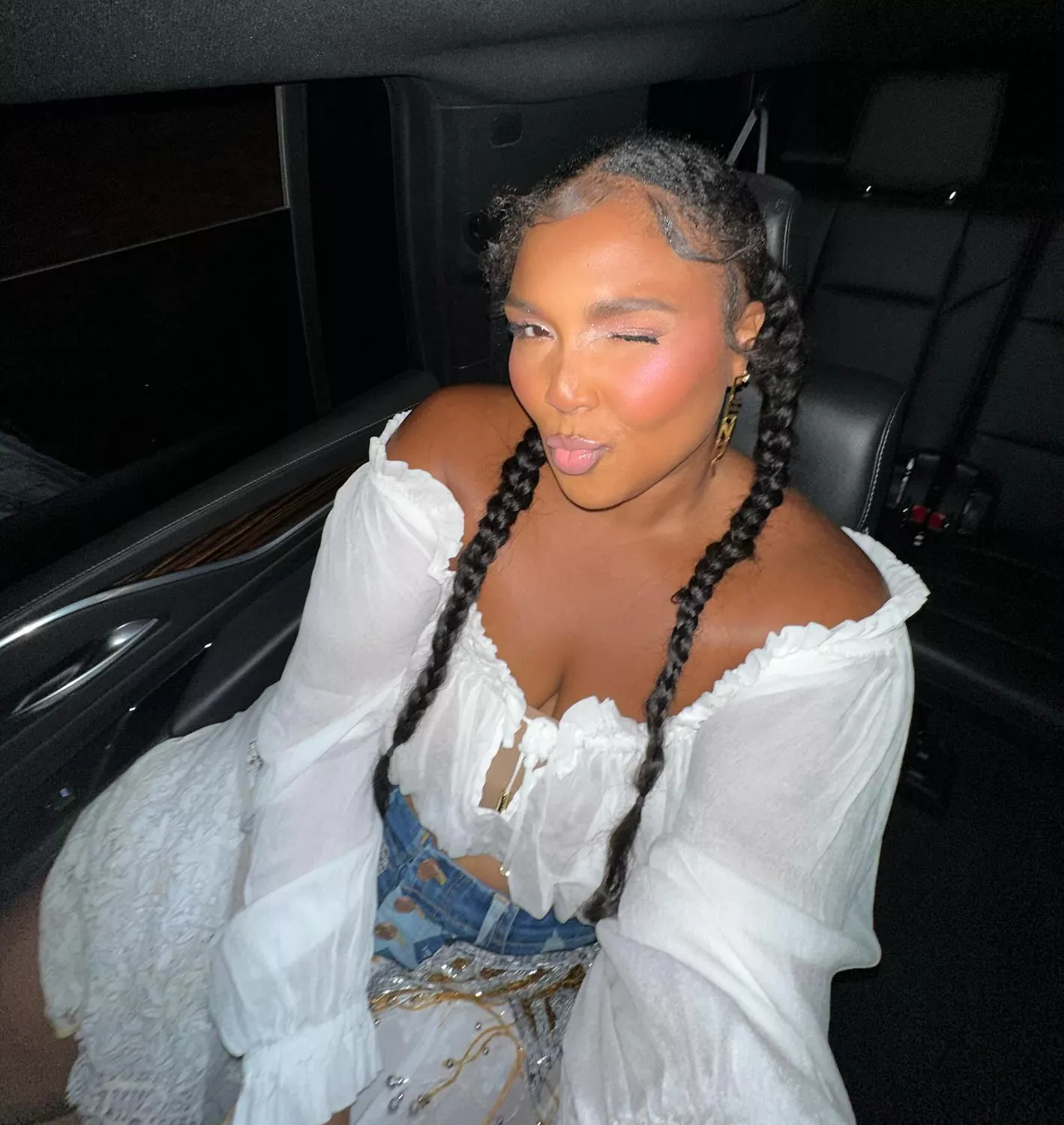 Lizzo posed and modeled two extra-long pigtails while donning a white off-the-shoulder number with sparkly silver eyeshadow and some pink blush.
