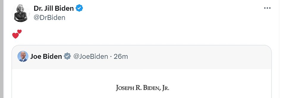 Jill Biden was the first to send her partner love and retweet his letter about quitting and added two hearts to the share.