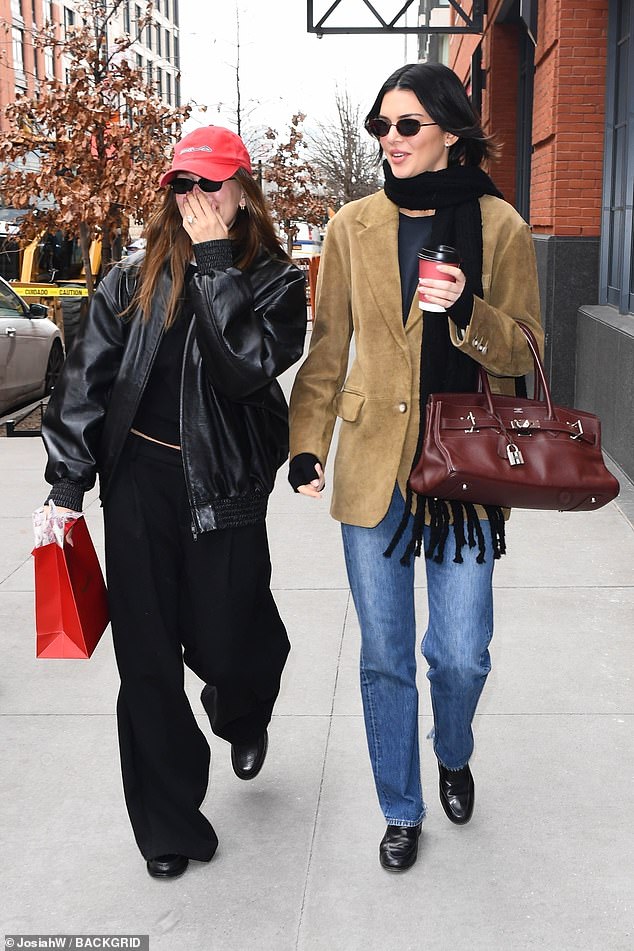 Meanwhile, Kendall sported pants, a gray t-shirt, and a tan-toned suede blazer paired with a black-colored knitted scarf and burgundy handbag.