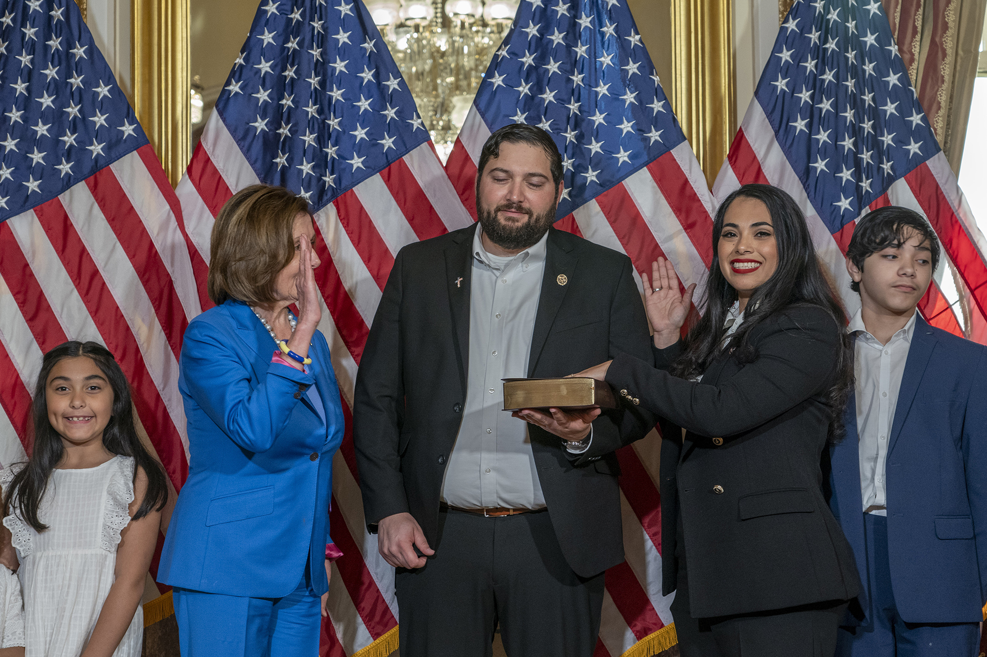 The video features the Speaker standing near Flores’ daughter, as she starts to wave across the family’s pastor. But then a moment arises where the speaker looks at the child, extends her elbow, and forcibly makes the child shift over.