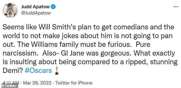 But that certainly didn’t happen as stars like Judd Apatow, Mandy Moore, and Kathy Griffin led the pack of celebs to first condemn Will Smith’s outrageously violent actions during the show’s live ceremony.