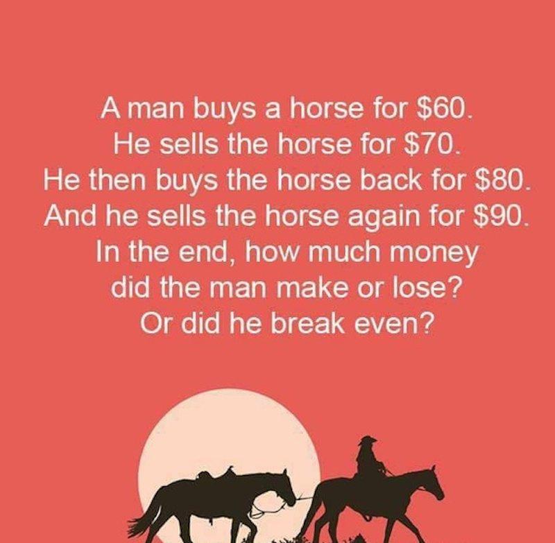 There is a man who bought a horse for $60 and he ended up selling that horse for $70. He then chose to purchase the horse back for $80. After that, he sold the horse again for $90. Now the main question is how much money he made or loss. Did he break even?