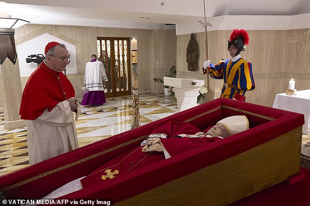 The late Pope’s body was also put inside an open wooden casket in the chapel of the Domus Santa Marta Hotel. Two Swiss Guards stood at attention as Farrell blessed Francis with holy water.