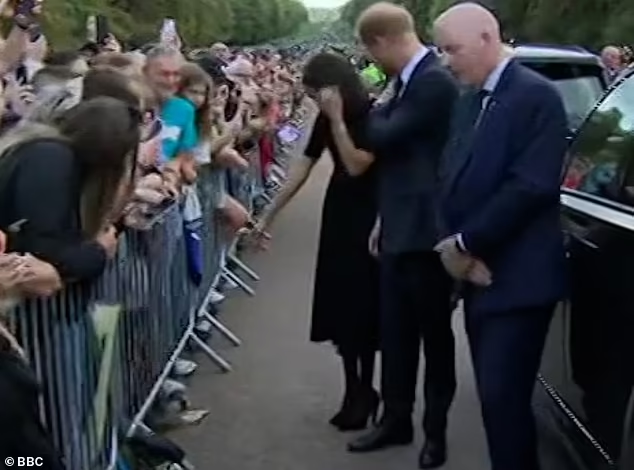 Prince Harry and Meghan joined Prince William and Kate as they greeted well-wishers gathering outside the royal estate. They also looked at floral tributes left for the Queen, who passed away at Balmoral at the age of 96.