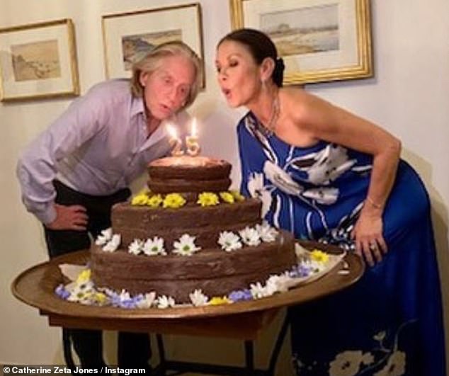 The heart-melting kissing shot showed a handsome Douglas seated without any shirt while he embraced and kissed his stunning wife while wrapping an arm around her too.