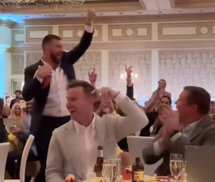 Swift was cringing throughout the moment that Kelce started to chant at the top of his lungs, ‘Viva Las Vegas’ and some felt he perhaps had one drink too many.