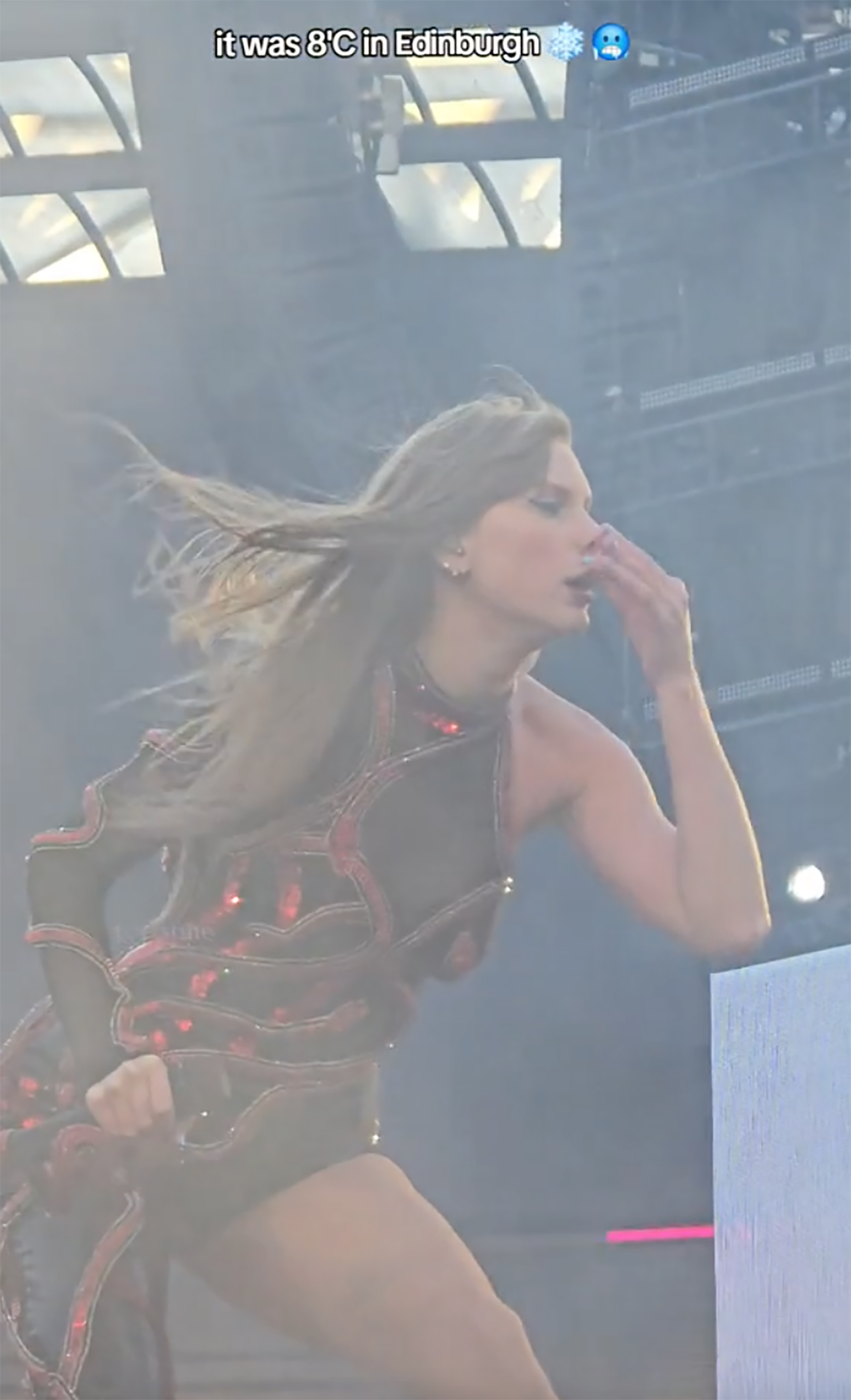 The celeb was caught on camera clearing her snot on her Eras Tour costumes while performing in Scotland recently.