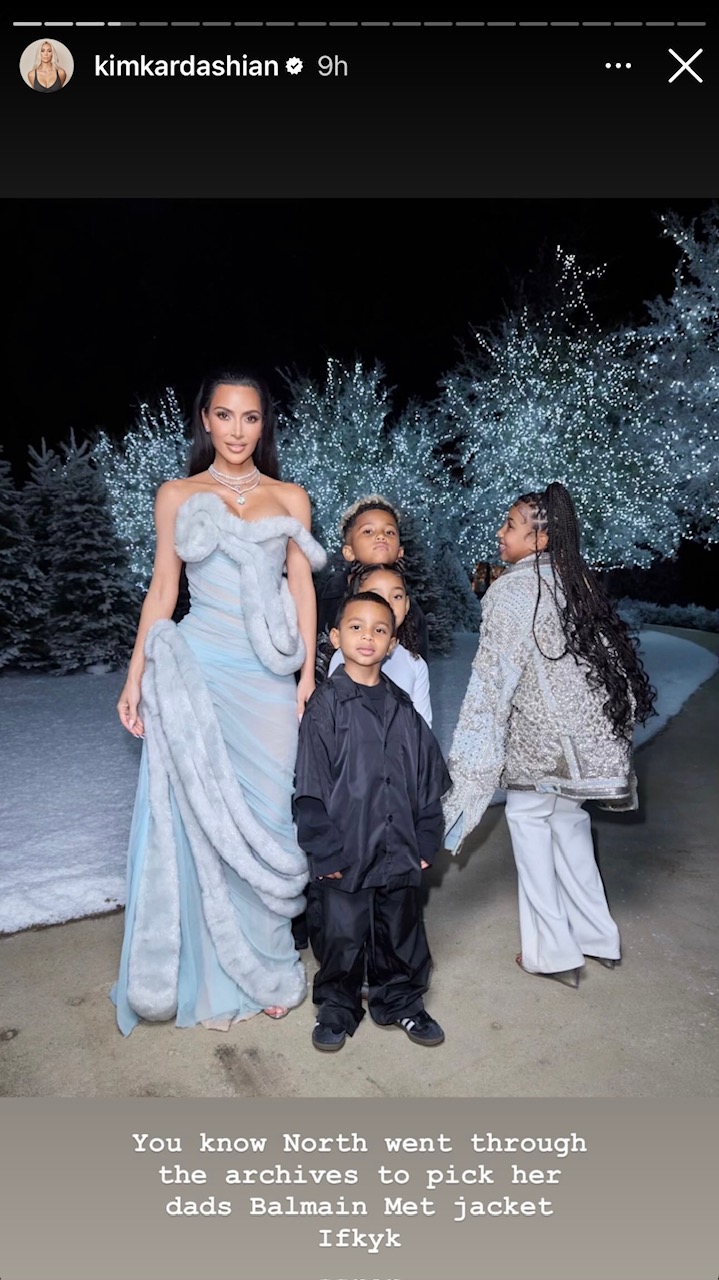 Kim explained online how North went through her Dad’s archives to figure out the perfect party look for today. She found it adorable and even spoke about how the theme also went perfectly with the jacket so why not?