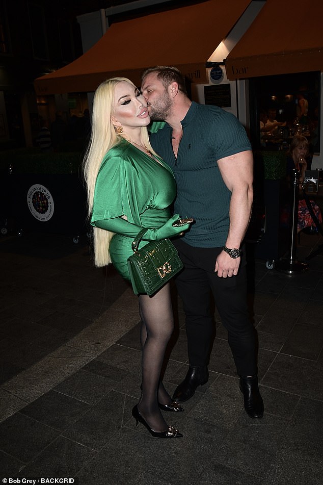 Jessica put forward a very busty display in her emerald green velvet number and even accessorized the look with some matching gloves and a handbag. Her lover on the other hand opted for a more casual look.