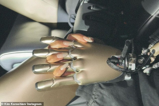 Not only did Kim opt to go topless under her puffy black jacket but the Kardashian star sat on the robot’s lap and posed in the driver’s seat of her custom Tesla Model S vehicle.