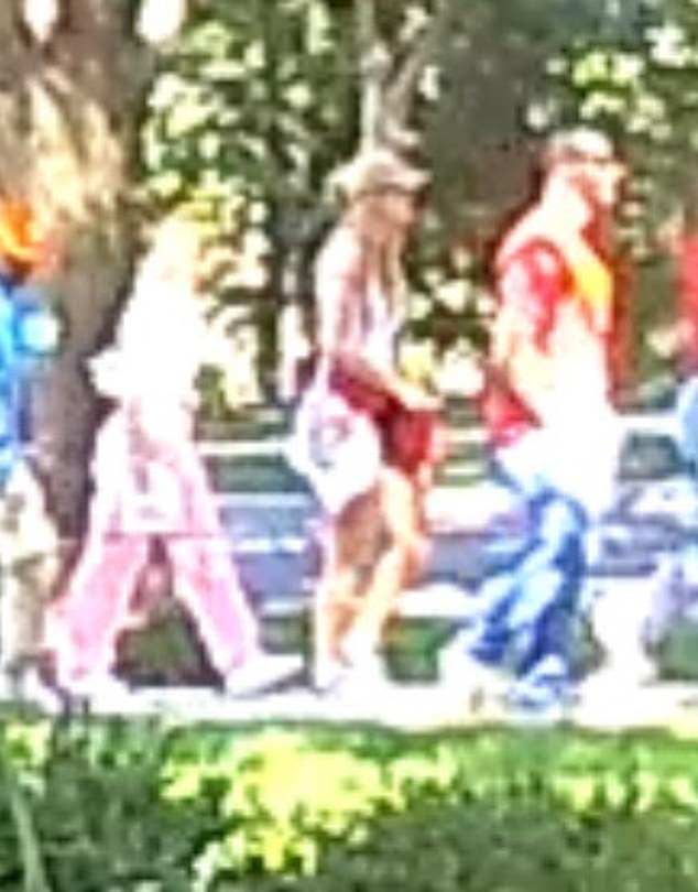Taylor is pictured wearing shorts and a hat, alongside a red-colored hoodie that’s wrapped around her waist. She even features a designer bag across her shoulder.
