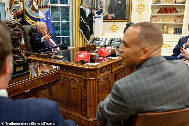 All three, plus Speaker of the House Mike Johnson and Senate Majority Leader John Thune, were pictured together in the image Trump posted to Truth Social yesterday. It was reported that hats were given as gifts to the two leaders, as per Punchbowl News, but Jeffries disputed that when he spoke on CNN Tuesday night.