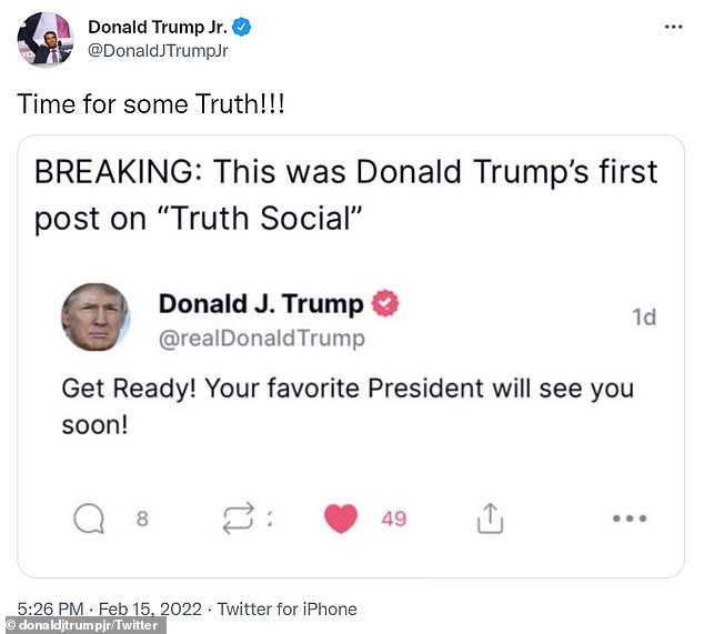 The former US President is almost back on social media as his son Donald Jr. recently posted a screenshot in what appears to be his father’s first post on the upcoming social platform called Truth Social.