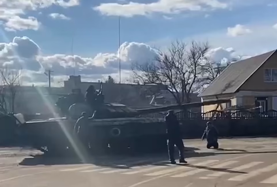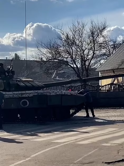 Earlier, one man jumped in front of a moving Russian tank and climbed on its front before clinging to the armored vehicle while it was moving.