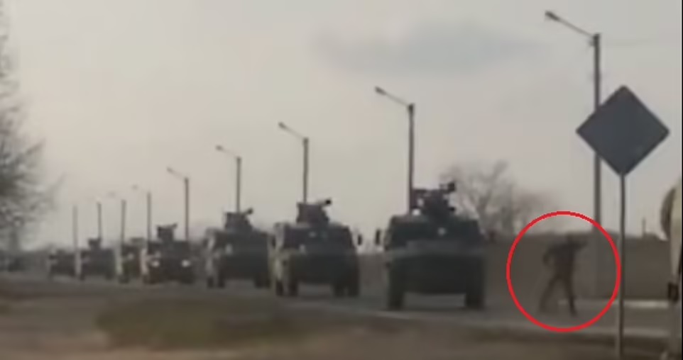 In yet another footage, a Ukrainian man slowed down a large convoy of Russian vehicles in the south of the country as he charged onto the road knowing it could very well cost him his life.