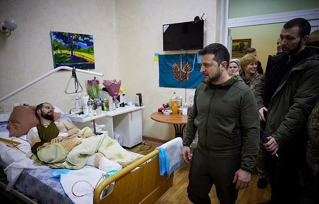 During his visit, President Volodymyr Zelensky thanked hospitalized troops for their service and awarded them medals for their bravery in their fight against the Russian oppressors.