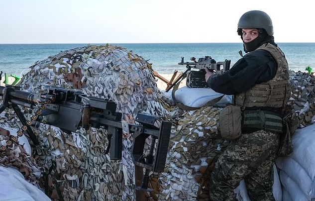 In other shots, scenes reminiscent of the events in Normandy in 1944 have emerged. In one particular photo, a Ukrainian soldier cladded in body armor is seen standing behind a barricade and pointing a firearm towards the beach and the open sea.
