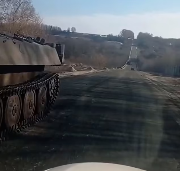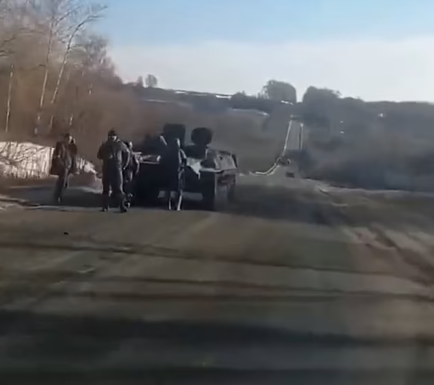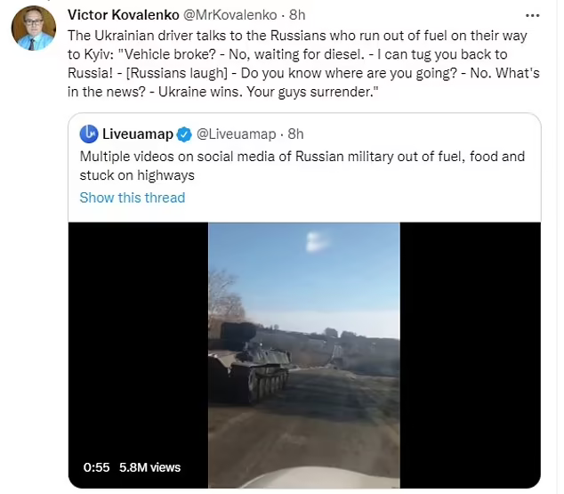 Kovalenko tweeted: “The Ukrainian driver talks to the Russians who run out of fuel on their way to Kyiv: “Vehicle broke? – Ni, waiting for diesel. -I can tug you back to Russia! – (Russians laugh) – Do you know where are you going? – No. What’s in the news? – Ukraine Wins. Your guys surrender.”