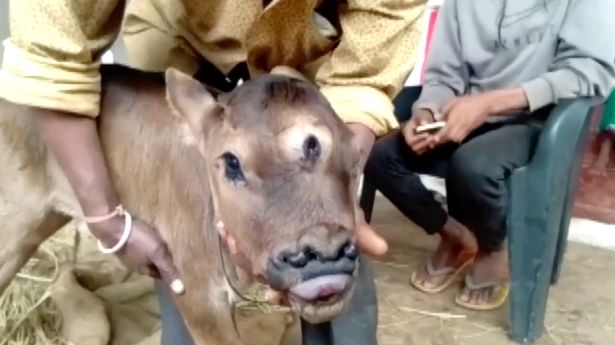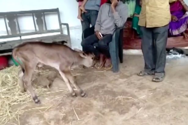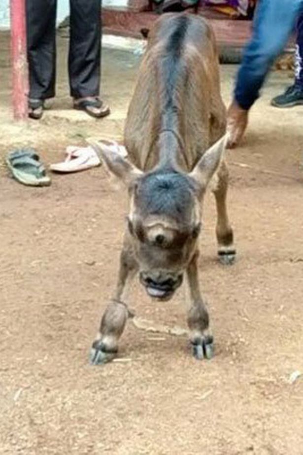 The animal was born on a farm in Chhattisgarh in India where locals rushed to take a peek.