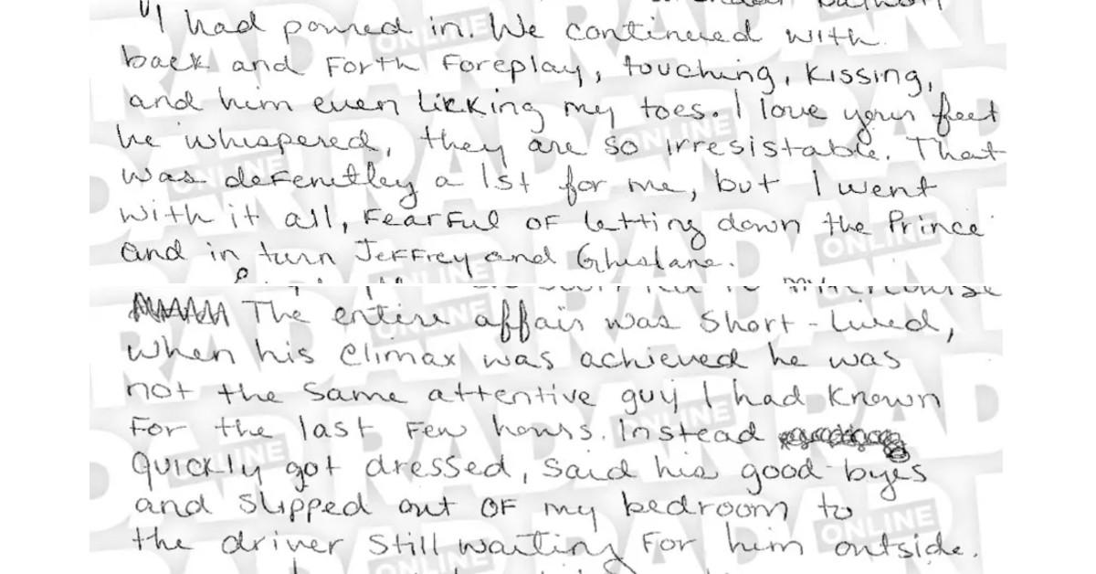As shared by one reporter who provided the extracts to Radar Online, Giuffre detailed the alleged encounter with Andrew during a trip that they both planned together.